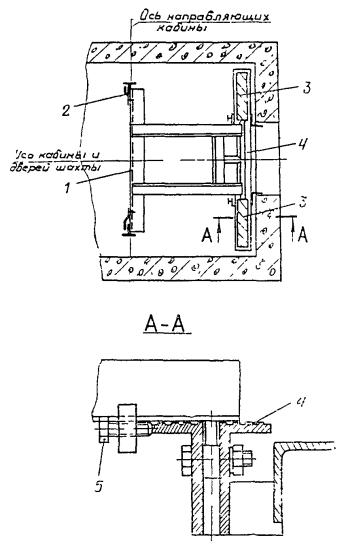 совместить стрелку кондуктора с отметкой, обозначающей ось двери шахты, и зафиксировать порог двери в кондукторе винтами. Порог должен быть установлен горизонтально как в продольном, так и поперечном направлениях. Допустимое отклонение от горизонтали не должно превышать 2 мм на всю длину порога;