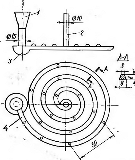 1 — литейный стояк, 2 — выпор, 3 — зумф под стояком, 4 - спираль