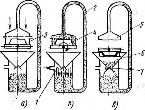 . При свободной засыпке песчано-смоляной смеси на модельную плиту (бункерный и рамочный методы) невозможно регулировать толщину в разных частях оболочки. Максимальную скорость формообразования и заданную толщину в определенных местах оболочки можно получать при помощи пескодувного метода. Один из вариантов пескодувного метода представлен на рис. 85. При пуске воздуха в резервуар1 песчано-смоляная смесь по трубе 2 поступает в рамку 3, закрепленную на нагретой модельной плите 4 и прижатую к головке 5 пескодувной машины. После образования оболочки необходимой толщины давление воздуха снимается, модельная плита опускается и поворачивается на 180° для сброса избытка смеси. Избыток смеси высыпается в бункер 6, расположенный под модельной плитой, и через открытый клапан 7 поступает в резервуар 1. Описанный метод, значительно увеличивая скорость формирования оболочки за счет уплотнения смеси сжатым воздухом, позволяет повысить производительность машин.