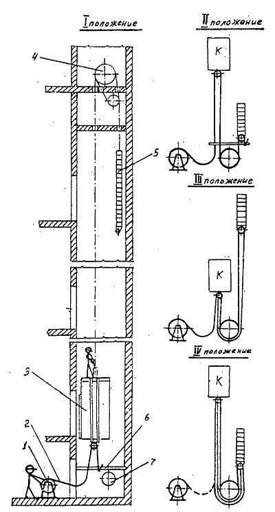 Рис. 13.42. Запасовка компенсирующего каната с использованием кабины лифта 1 - катушка размоточная; 2 - канат компенсирующий; 3 - кабина; 4 - лебедка; 5 - противовес; б -балка; 7 - блок натяжного устройства