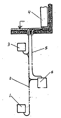 Рис. 13.50. Схема прокладки жгутов проводов по шахте ' - нижняя этажная коробка; 2 - жгут №1; I - верхняя этажная коробка; 4 - НКУ; 5 -жгут №2; 6 - клеммная коробка №2