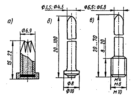 Рис. 13.10. Патрон и дюбеля а - патрон; б - дюбель-гвоздь; в - дюбель-винт