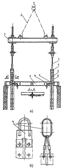 а - закрепление «нитки» на монтажной балке; б - варианты захватов; 1 -